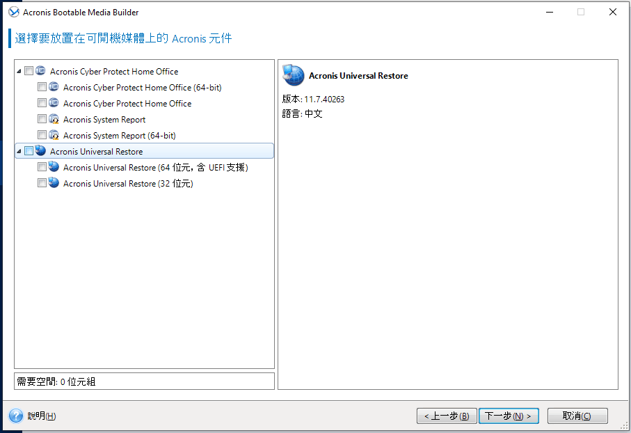 9. 選擇要放置在媒體上的 Acronis 元件。