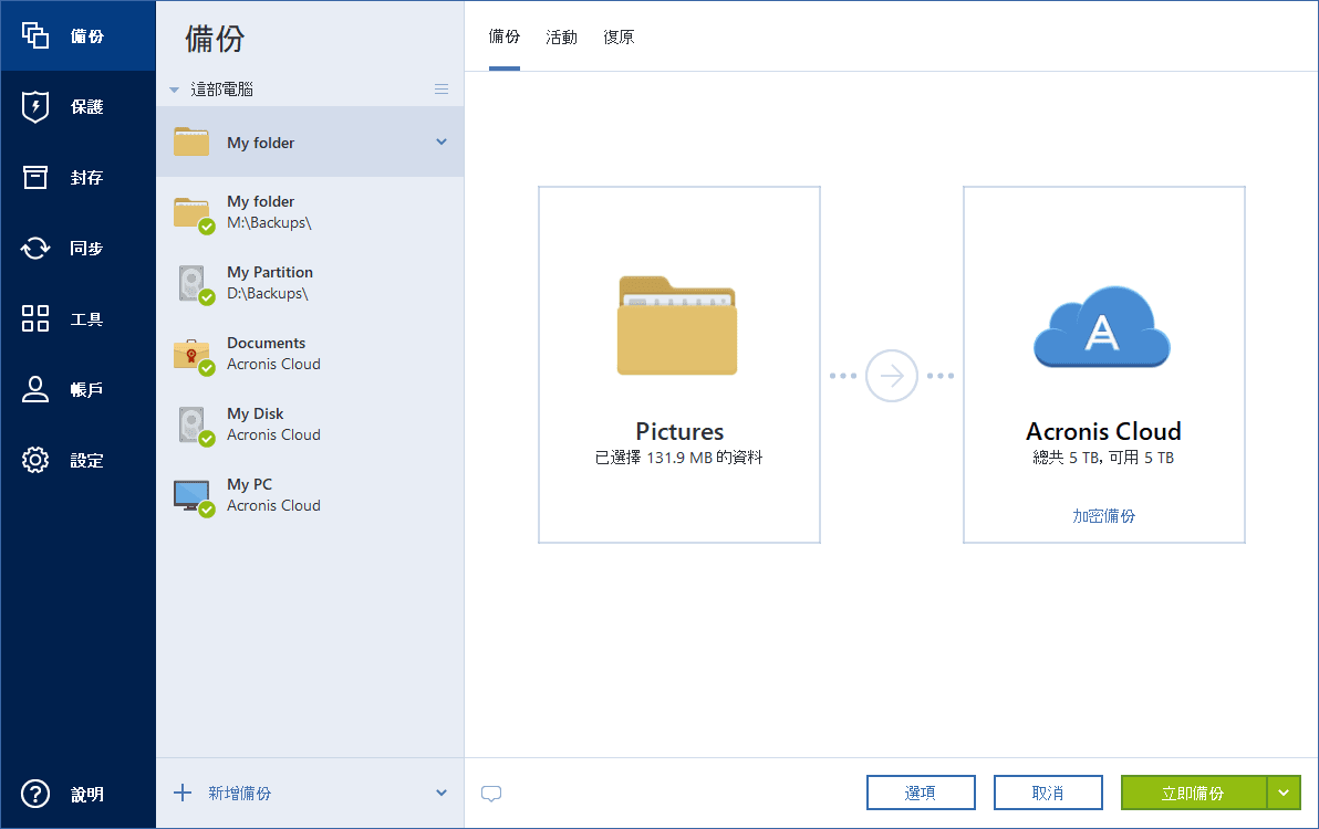 將資料備份至 Acronis Cloud 時,完成第一個備份可能相當耗時。後續的備份程序速度會快得多,因為只有檔案的變更才會透過網際網路傳送。