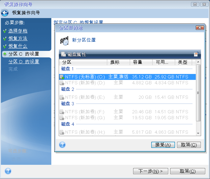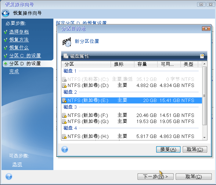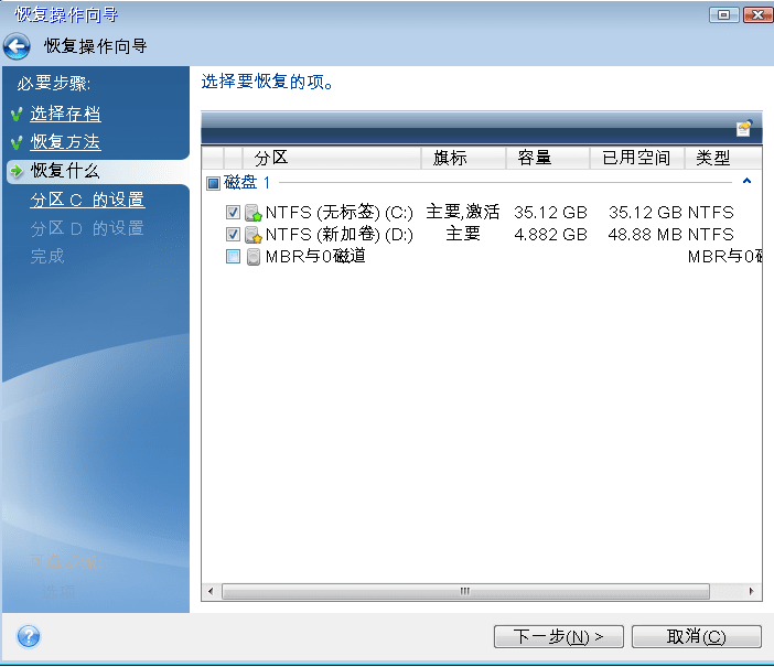在恢复内容步骤中,选择要进行恢复的分区旁边的方框。