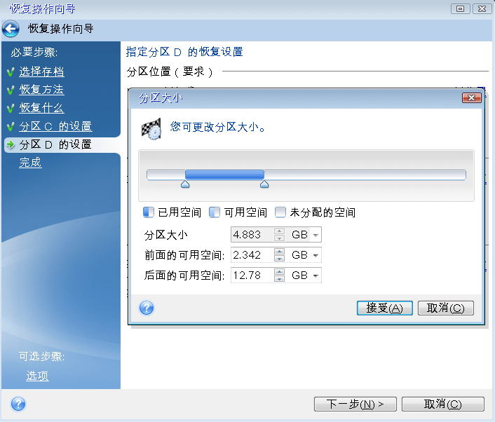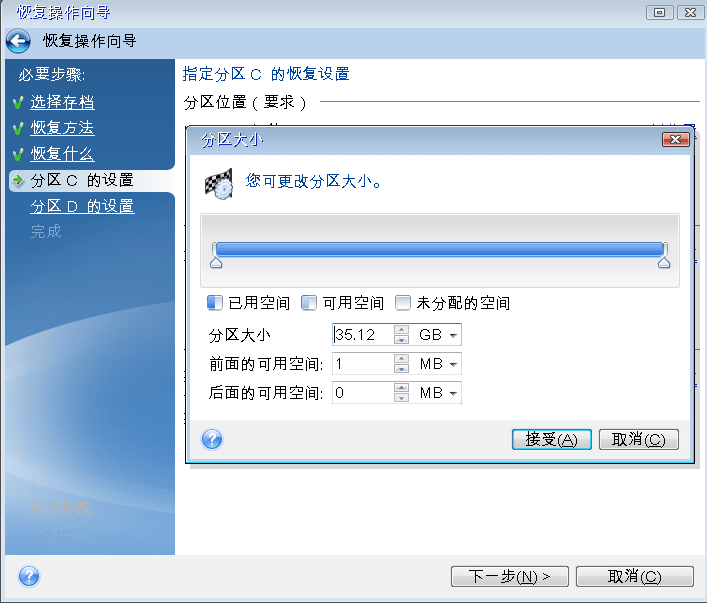 - 大小 - 在分区大小区域中单击更改默认值。默认情况下,分区会占据整个新磁盘。在“分区大小”字段中输入正确的大小(您可以在恢复内容步骤中看到此值)。然后,将此分区拖动到您在“备份信息”窗口中看到的相同的位置(如果需要)。单击接受。