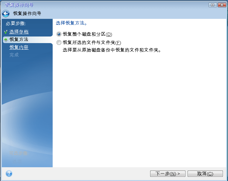 在恢复方法步骤中选择恢复整个磁盘和分区。