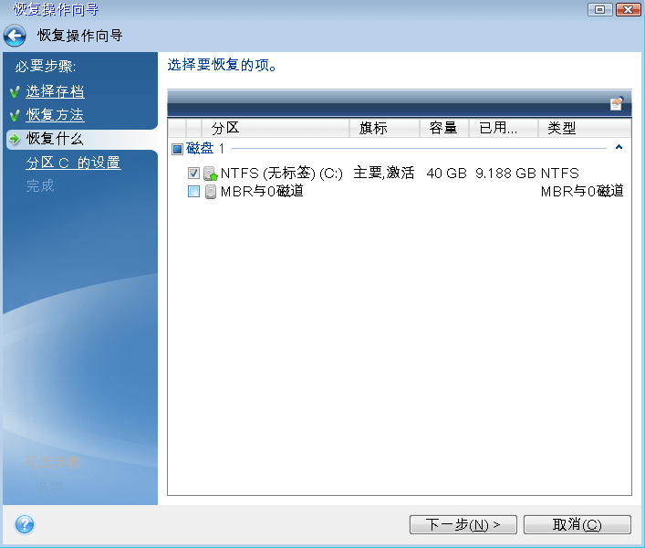 - 在“分区 C 的设置”(如果分区不同,则为系统分区的代号)步骤中检查默认设置,如果正确则单击下一步。否则,在单击下一步之前根据需要更改设置。恢复到不同容量的新硬盘时,需要更改设置。