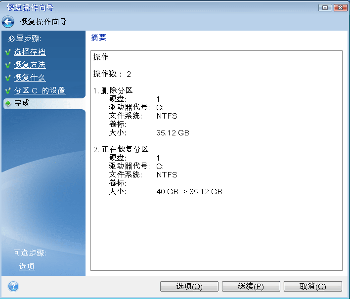 在完成步骤中仔细阅读操作摘要。如果没有重新调整分区的大小,那么删除分区和恢复分区项目中的大小必需匹配。查看完摘要后,单击继续。