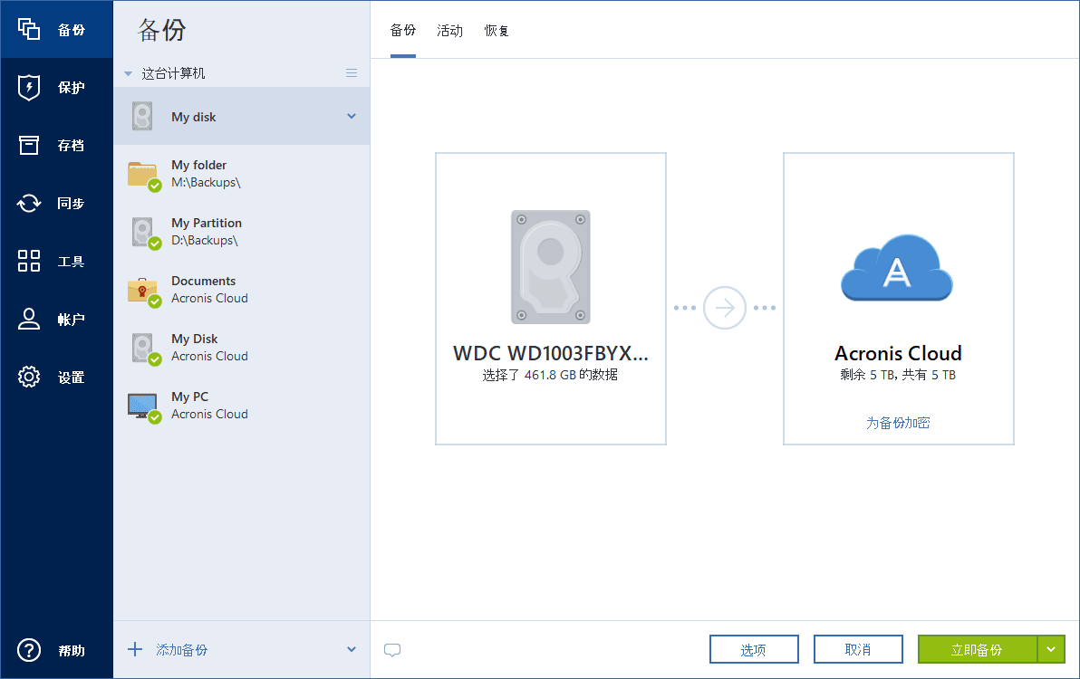 当您将数据备份至 Acronis Cloud 时,第一个备份可能会花费大量时间才能完成。进一步的备份过程可能会快得多,因为届时将仅通过互联网传输对文件的更改。
