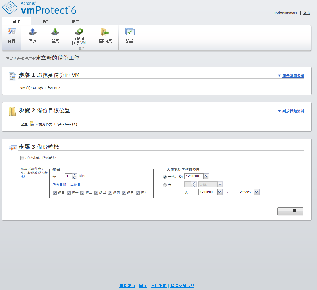 取消选中不预定、按需运行复选框以设置您预定备份数据的频率。Acronis vmProtect 允许每周预定并且可在 Windows 和 Linux 操作系统中运行。