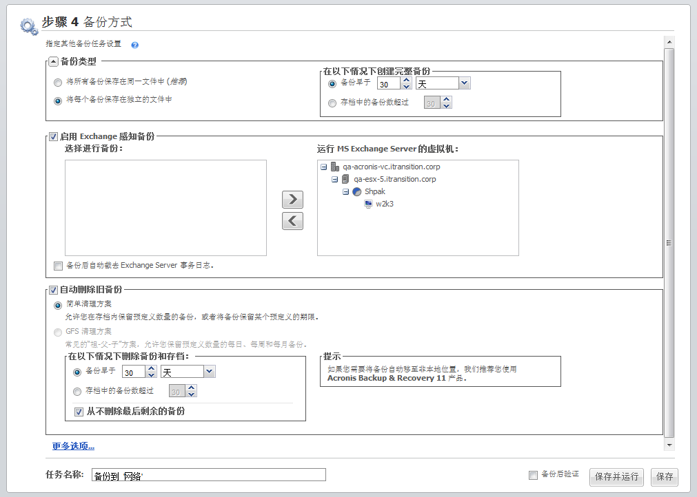 创建备份向导,步骤 4“备份方式”,简单清理方案,删除过期的备份